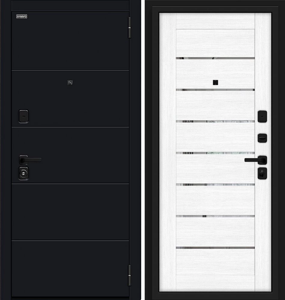Надежная входная Дверь Браво Прайд Total Black/Snow Melinga премиум класса по цене 39 830 руб. Большая толщина стали защитит от проникновения в ваш дом, квартиру или коттедж. Используется очень качественная фурнитура: замки, цилиндры, ручки, защелки. Покрытие и отделка двери изготовлено под внимательным контролем производителя. Дверь имеет долгий срок службы и гарантию.